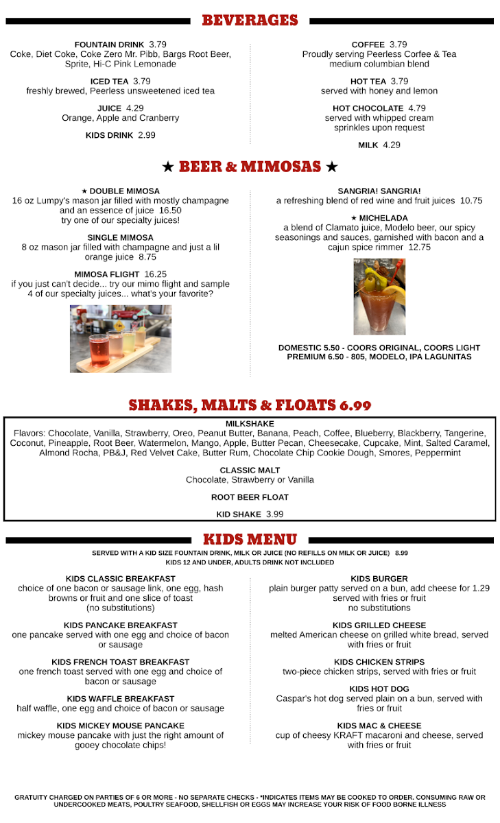 Lumpy’s Diner Antioch offers a menu that captures the essence of a classic American diner with a focus on comforting, satisfying dishes. Here, the menu is filled with hearty breakfasts, brunch favorites, and familiar lunch and dinner options—perfect for starting the day or enjoying a casual meal with family and friends.